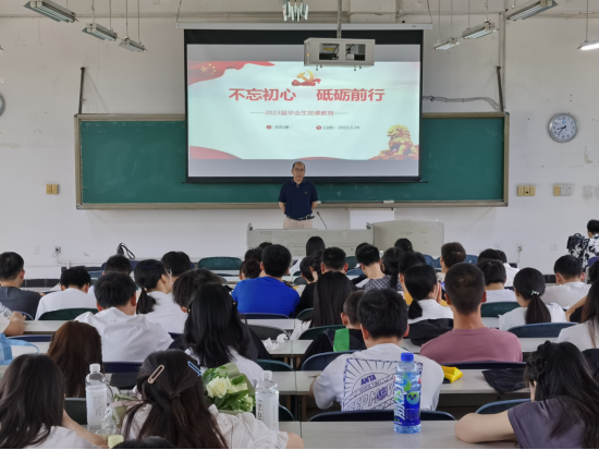 主讲人从共产党人“初心”入手,解释党章中“全心全意为人民服务的宗旨”的时代内涵,呼吁大家在今后学习和工作中紧扣时代脉搏,加强党性修养。他要求全体毕业生党员,一是要参加到学习习近平新时代中国特色社会主义思想主题教育活动中,学习党的理论知识,学习党的二十大精神,吸取丰富的政治营养,补足精神之“钙”;二要从中华传统美德中汲取养料,培养律已修身、诚信担当、以义制利、自强不息的良好品德,常修做人之“德”;三是断提高政治敏锐性和鉴别力,加强自身纪律规矩学习,遵守党纪国法,常敲警示之“钟”。