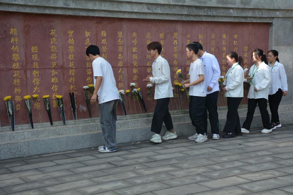 纪念碑前安静肃穆,全体师生胸戴党徽、团徽,手捧寄托哀思的黄白菊花,敬献鲜花,全体人员肃立默哀3分钟,深切缅怀革命先烈。