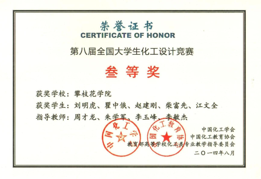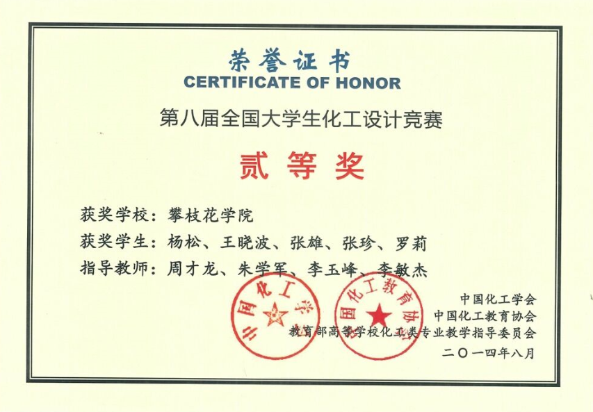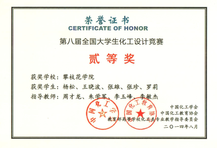 第八届全国老员工化工设计竞赛中荣获二等奖、三等奖。