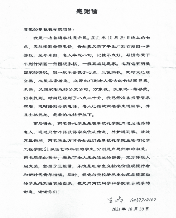 近日,学校收到市民王某的一封感谢信,对生化学院(农学院)2021级园艺本科班的员工卢思师和冷淑蓝护送王某八旬父亲回家表示感谢。