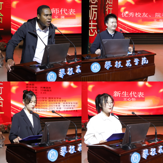 教师代表安澜表示,大学学习在于学无止境,鼓励员工要以学充实自我,走出舒适圈,找到更广阔的世界。优秀员工、院科研科科长王俊寄语师弟师妹们要学习勤奋努力,生活充满热情,保持自强自律。老生代表、2021年度国家奖学金获得者徐诗蕊激励学弟学妹们要坚定自律文明人格追求,用实际行动践行新时代“自律攀大人”的承诺。新生代表王心怡表示,要合理规划大学四年,树立明确目标,擦亮自律底色,砥砺奋斗,不负青春。