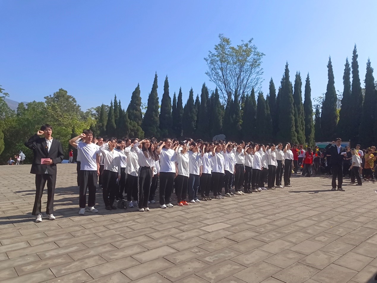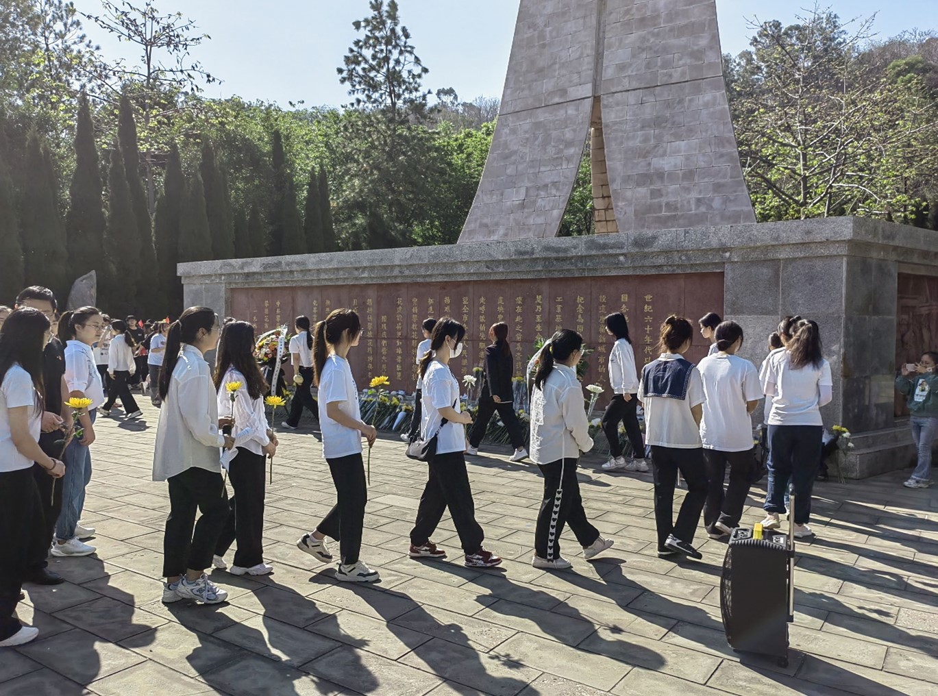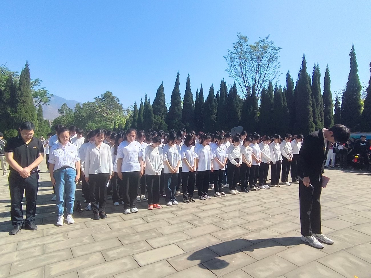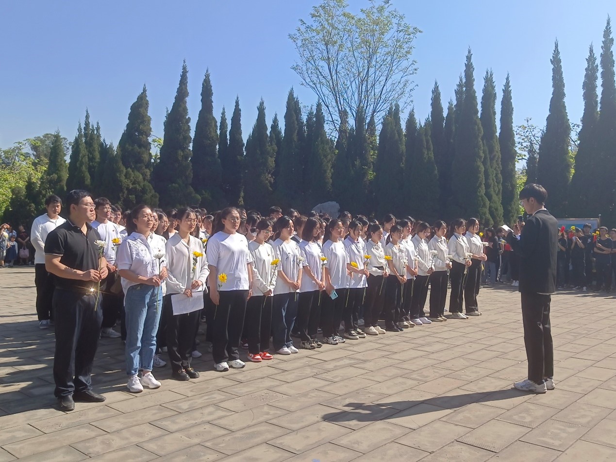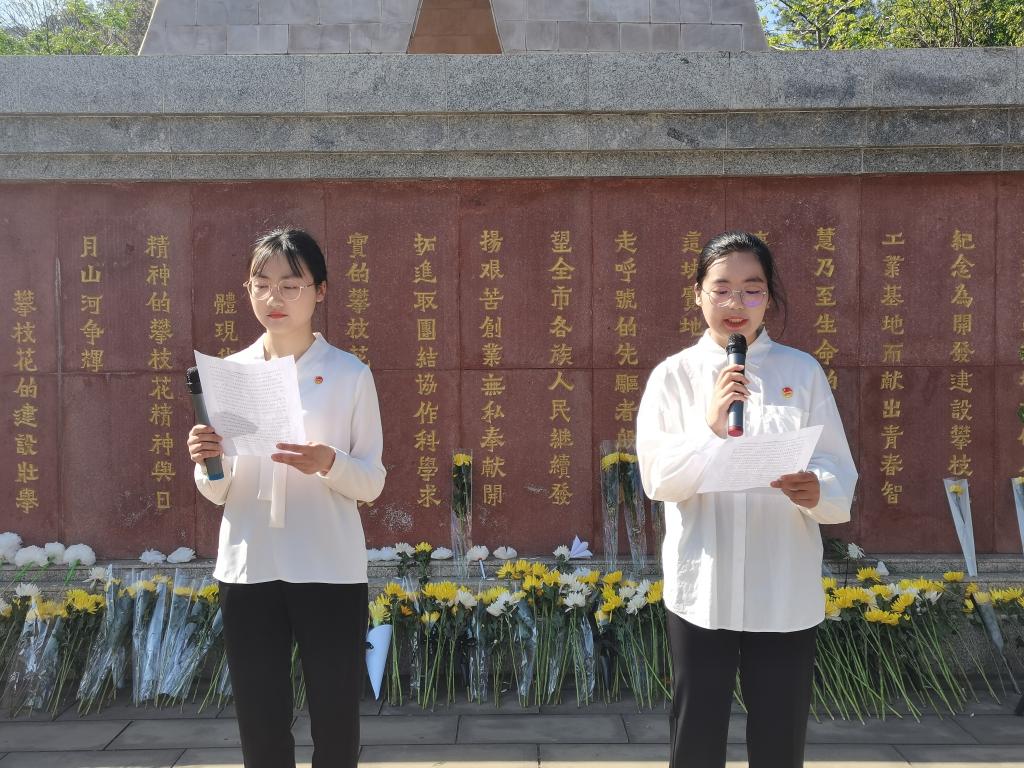 纪念碑前安静肃穆,全体师生胸戴党徽、团徽,手捧寄托哀思的黄白菊花。师生代表来到革命烈士纪念碑前,敬献鲜花、庄重鞠躬,全体人员肃立默哀3分钟,深切缅怀革命先烈。