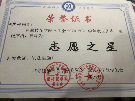 罗杰,王饶浙,陈莉华,阿支伍星、冯荧萍等同学在家乡积极参与疫情防控工作。作为自律攀大人,他们积极响应社区、学校、政府的号召,致力于疫情防控志愿活动,在群众需要的地方发光发热。其中罗杰同学荣获宜宾市叙州区“优秀志愿者”等荣誉;在2022年6月,班级成员积极参加“逐梦计划”、“三下乡”、“返家乡”等社会实践活动,积极参与岗位实习,下乡支教等实践活动。王饶浙所在“自律支教,彝路童行”支教团队荣获暑期“三下乡”四川省“优秀团队”;班级成员积极组织活参加志愿服务活动,在有限的时间做无限的事,帮助群众,服务社会。班级志愿时长达1000余小时。