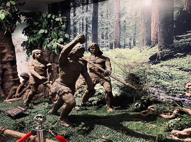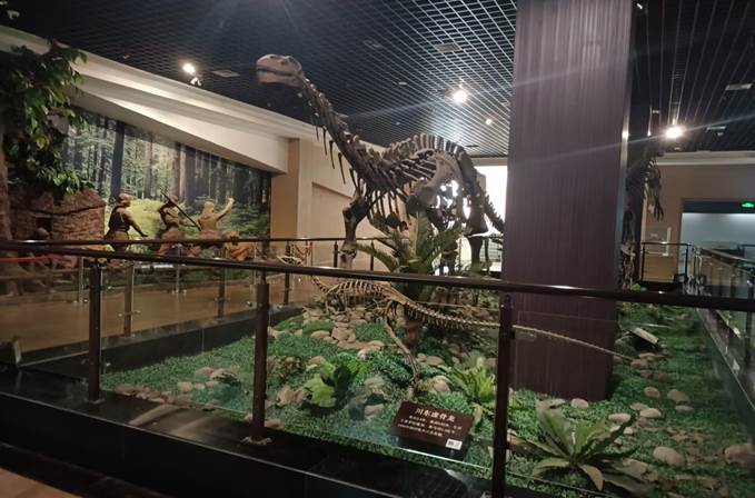 第一层为走进恐龙时代,讲述了达州是川东重要的恐龙化石分布地之一,自上世纪60年代以来,达州境内出土了一批脊椎动物早期代表,以及第四纪哺乳动物化石等。同时,该展厅还通过仿真模型和雕像展示了远古人类生活的场景。