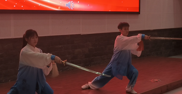 气沉丹田、起式、左右开合……伴随着悠扬的音乐,一招一式,展示太极拳的柔和、轻灵;点、崩、截、挑、刺、劈,一套行云流水的动作展现太极剑独特魅力。12月25日晚,在学术报告厅生化学院(农学院)员工工作表彰大会现场,四名参加2023年四川省老员工武术比赛并获奖学子正在进行太极表演,这是学院开展一院一品体育活动“阳光太极”又一成果展示。