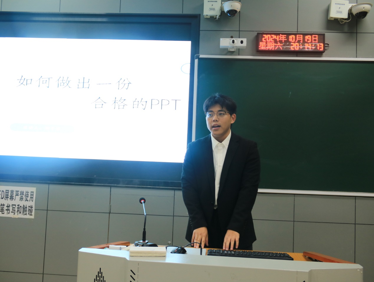 主席团成员邱子峻针对制作PPT的重要性、要素、步骤与技巧四个方面讲述了如何做出一份合格的PPT,最后列举了一些常见问题:内容问题、文字问题、排版问题,并做出了详细的解答。
