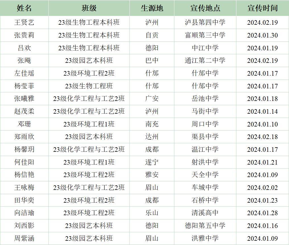 此次招生宣传寒假专项实践活动共招募宣传员18名,分布四川省13个市,分别为成都(2名)、眉山(2名)、广安(1名)、泸州(2名)、遂宁(1名)、乐山(1名)、雅安(1名)、什邡(2名)、南充(1名)、自贡(1名)、德阳(2名)、巴中(1名)、达州(1名)。