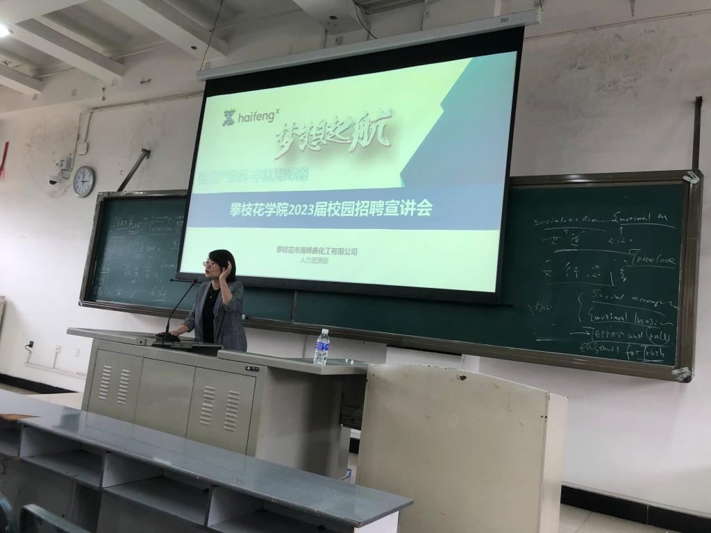 攀枝花市海峰鑫化工有限公司人力行政总监张锦秀做招聘宣讲。张总监介绍公司的创业过程、管理模式、招聘岗位及薪资待遇等,并播放公司的宣传视频,同时鼓励同学们积极投简历,去发挥自己的特长、展现自己的能力,自信就业,积极投身并参与公司的建设与发展。