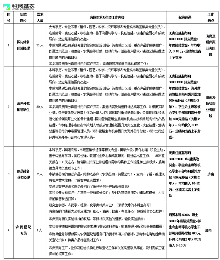 来吧!有志投身农化事业、实现自我价值的有识青年,科赛基农正敞开温暖的怀抱,诚邀你的加盟!你将获得不断成长的机遇与空间、全面提升的素养与技能、展现自我价值和实现人生梦想的瑰丽舞台!