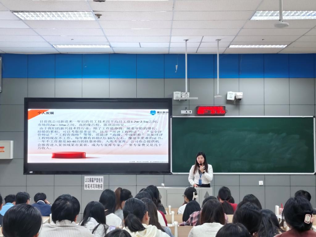 美亿集团公司负责人,学院2007级环境工程专业员工刘红霞开展自身经历分享及招聘宣讲,她以自身教育经历和老员工活为引,与同学们分享了成长的点滴与感悟,强调自信、努力与积极就业的重要性,为同学们注入了满满的正能量。宣讲过程中,刘红霞通过精彩的PPT向同学们详细介绍了美亿集团的发展历程、业务版图和企业文化。在介绍岗位要求时,她明确指出,除了扎实的专业知识,沟通表达、组织协调与团队协作能力同样至关重要。