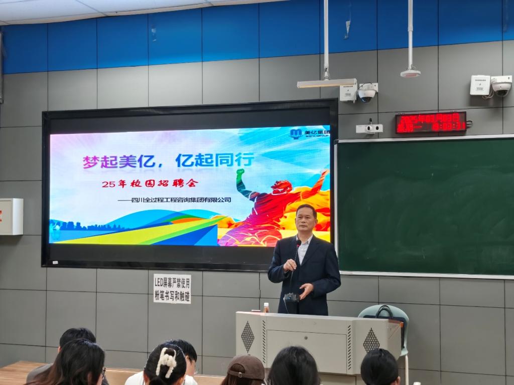 3月3日晚上,四川全过程工程咨询集团有限公司(简称“美亿集团”)在1-101举行校园招聘宣讲活动。学校招就处处长唐林、学院员工科科长巩元勇、公司负责人及2021级部分员工参加此次活动,巩元勇担任主持人。