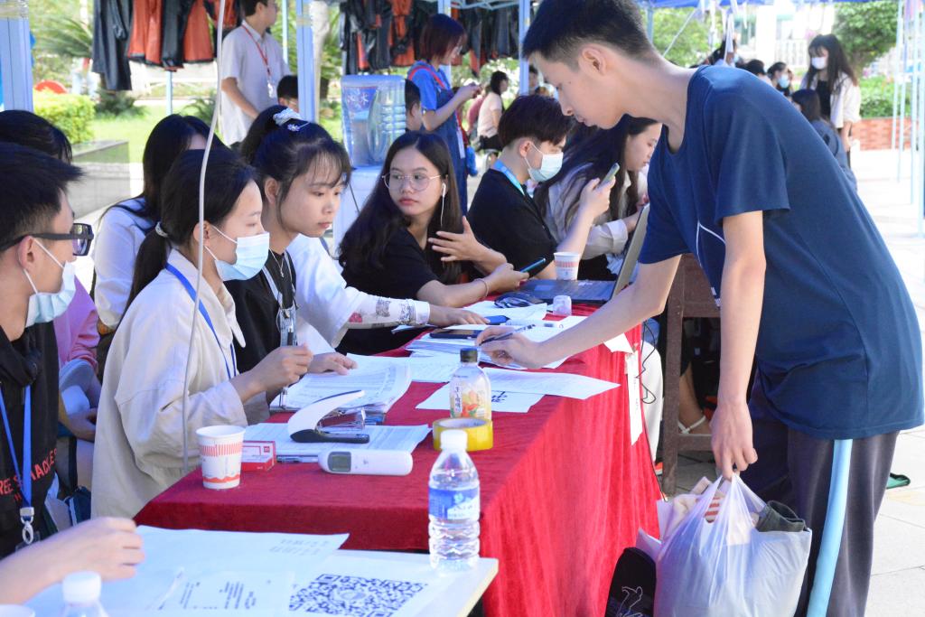 2020年9月20日,公司员工会值班工作人员于南门办公楼前继续开展最后一天的迎新工作。员工科科长陈华、分团委书记李学武与2020级辅导员卢进也来到迎接点同工作人员一起迎接新生。