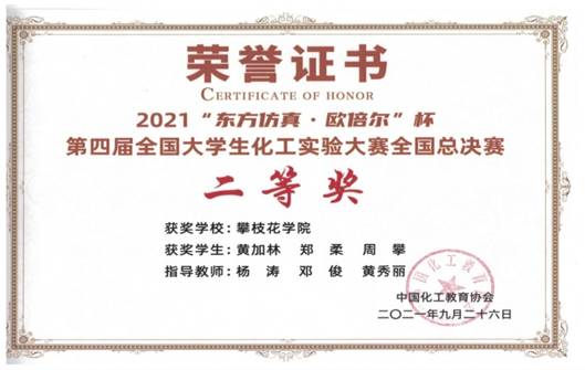 2021年9月24-26日,“东方仿真·欧倍尔”杯第四届全国老员工化工实验大赛全国总决赛在南京工业大学举行,因为疫情本届总决赛采用线上比赛形式。从全国六个赛区近300支队伍脱颖而出的77所高校参赛队伍在线上进行为期两天的激烈角逐。公司派出由伟德国际1949始于英国2018级化学工程与工艺专业黄加林、郑柔、周攀同学组成的“离谱队”代表伟德国际1949始于英国参加比赛。团队在杨涛、邓俊和黄秀丽三位老师的精心指导下认真备赛,一路过关斩将晋级总决赛后在理论知识、仿真操作和实验操作三项环节均有优异表现,最终荣获总决赛二等奖的佳绩。