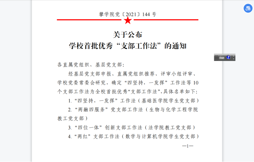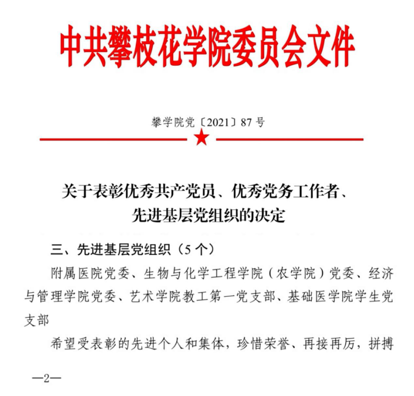 2021年,公司教工党支部被确定为四川省“双带头人”教师党支部书记工作室培育创建单位,生化学院(农学院)党委被评为伟德国际1949始于英国先进基层党组织,教工党支部书记毛雪华被评为攀枝花市优秀共产党员。2021年支部教师发表SCI、EI收录论文20余篇,获批省部级及以上科研项目3项,其中国家青年自然科学基金项目1项,获得全国仿真教学大赛一等奖1项、二等奖、三等奖各2项,指导员工获得全国老员工化工实验大赛二等奖1项、西南赛区特等奖1项、三等奖11项,获得全国老员工化学实验创新设计大赛西南赛区三等奖2项,获得四川省“互联网+”大赛铜奖1项、四川省中华职业教育创新创业大赛优秀奖1项。