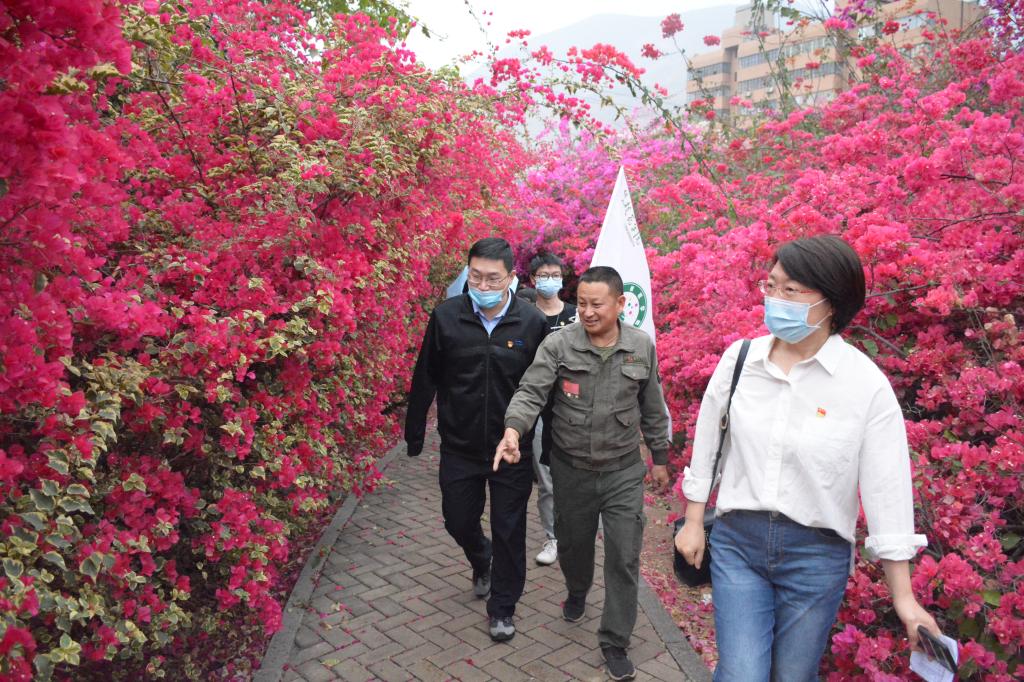 河门口和工作人员介绍三角梅