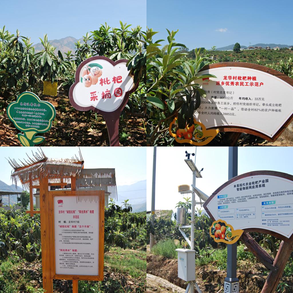 行走在美丽的乡间小道上,“田园变公园、农田变景区、农房变客房”的美丽乡村映入眼帘。龙华村坚持生态先行的理念,推行“诚信红线”“阳光节水”等制度,破解产业发展中争水、过度使用农药、提前上市扰乱市场等问题产业发展难题。在枇杷林中,不同区域标示“种植示范区”和农户信息介绍,随处可见太阳能“光感驱虫器”,高效节水灌溉,水管员巡逻,枇杷控时开花,精细化管理技术以及物联网智能水肥药一体化系统的集成运用,展示着龙华村枇杷种植规模化和规范化。