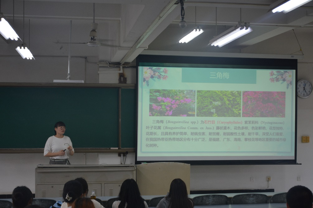9月19日下午,孙蓉在2-301开展以“多彩三角梅”为主题的讲座。讲座从三角梅的简介,蓝色三角梅的育种,抗寒三角梅筛选,三角梅的应用,三角梅鉴赏五个方面进行全面讲解。重点从变褐率、低温半致死温度、生理生化性质讲解如何筛选抗寒的三角梅,让我们了解到了什么样的三角梅可以抗寒,同时,同学们也在她的带领下,欣赏了学校里多姿多彩的三角梅,领悟到了学校不一样的风采。
