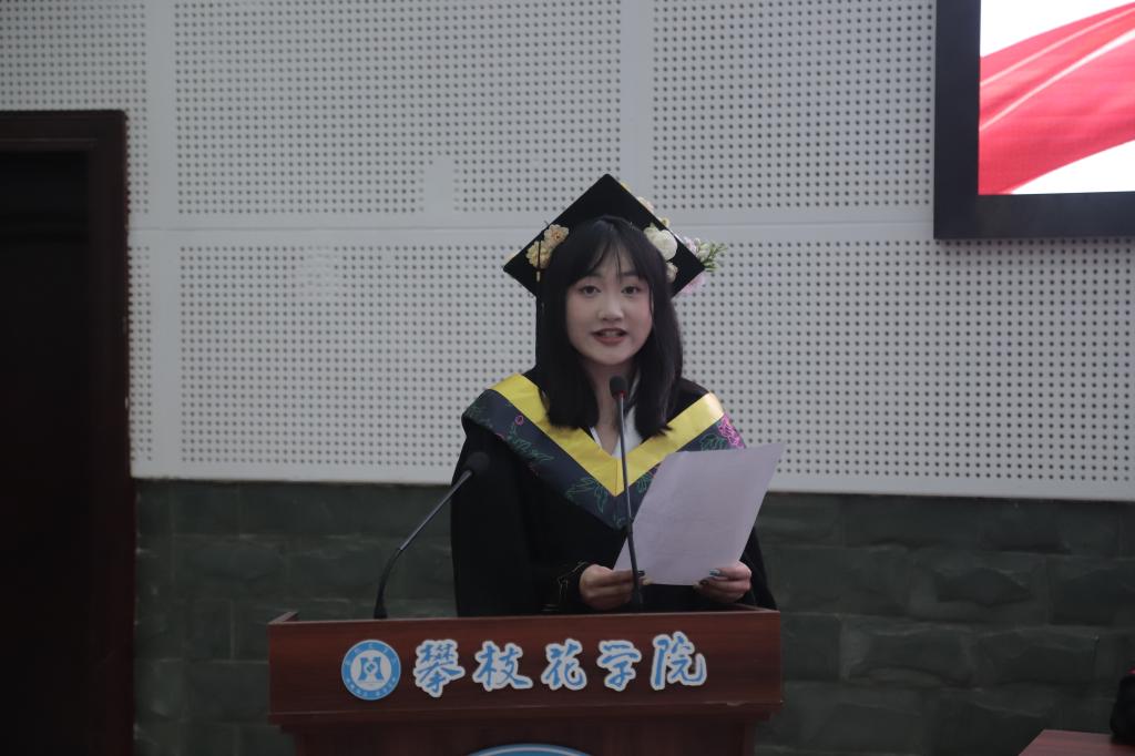 毕业生代表黄芮同学上台发言,她以真挚的语言分享了在学院的求学点滴,表达了对母校、师长和同窗的感激之情,并号召全体毕业生牢记初心,勇敢追梦。
