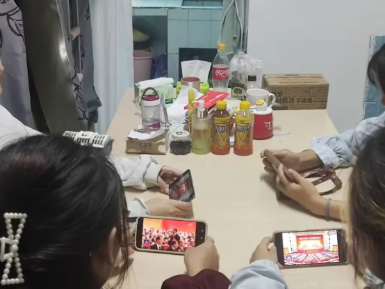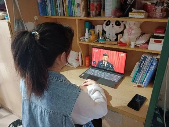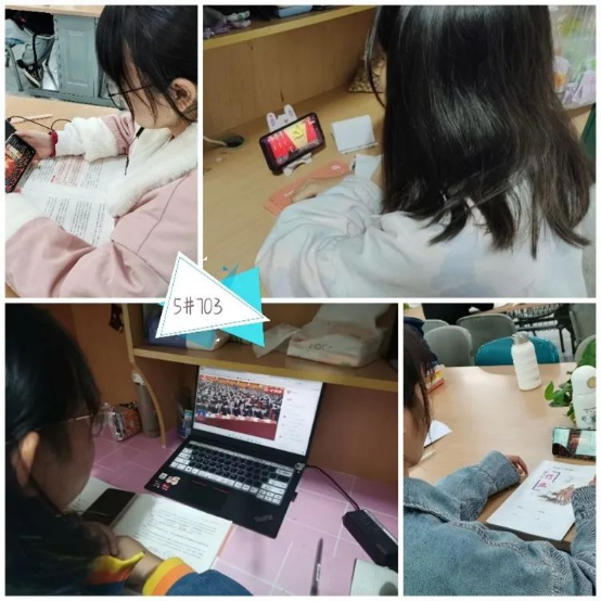 (同学们在寝室、图书馆等地观看二十大)